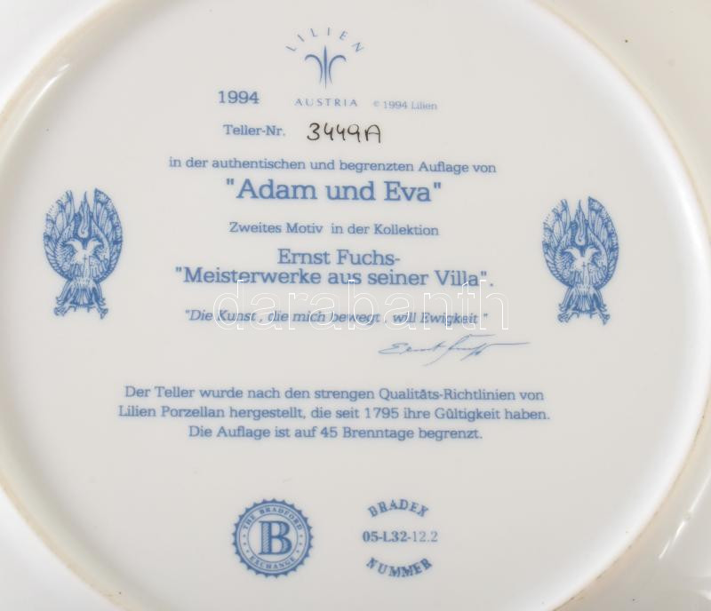 1994 "Ádám és Éva" német porcelán dísztál, jelzett, hibátlan, 21x21 cm