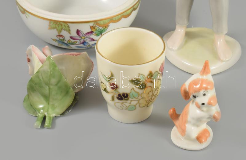 5 darabos magyar porcelán tétel, Herendi bonbonier alj, sérült Hollóházi figura, Zsolnay pohár, stb.