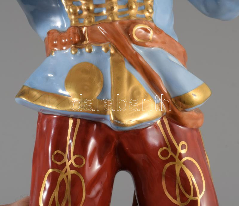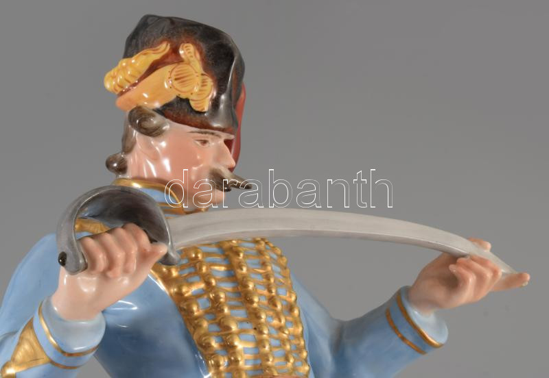 Herendi Hadik huszár, tervező: Kisfaludy Strobl Alajos. Színesen festett porcelán, bokái restauráltak, kard vége sérült, m: 40 cm. Talpazaton "Emlékül az M.N. 5232 Parancsnokságától" felirattal.