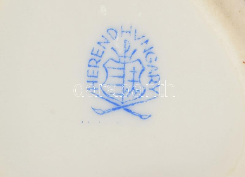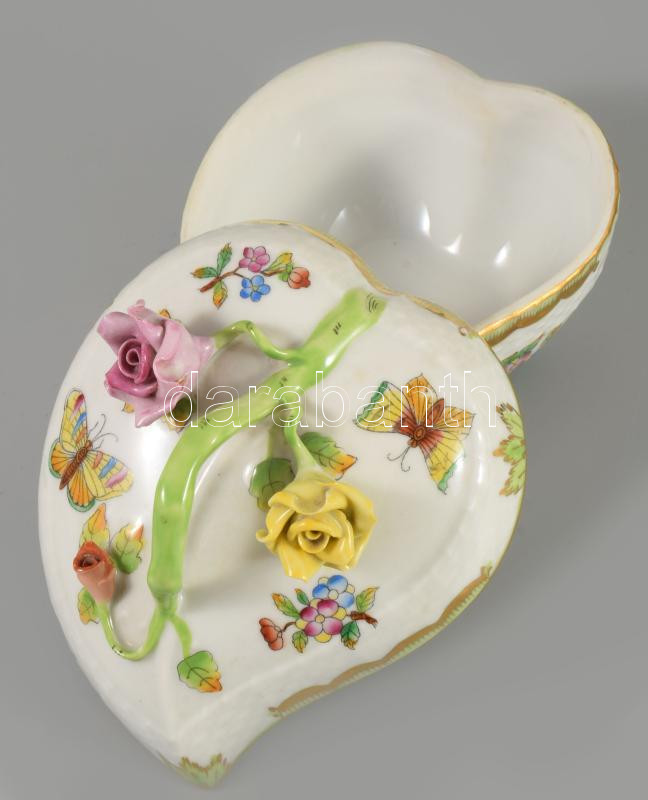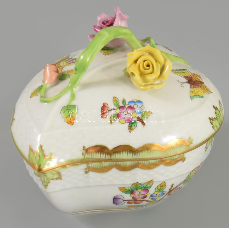 Herendi Viktória mintás szív alakú bonbonier, plasztikus fogóval, jelzett, hibátlan, 12x10 cm