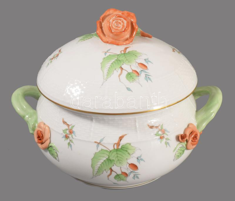 Herendi hecsedli mintás leveskínáló edény rózsa fogóval. Jelzett, 2. oszt., hibátlan, m: 20,5 cm