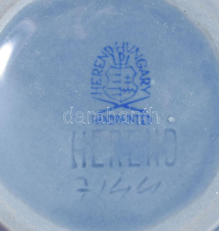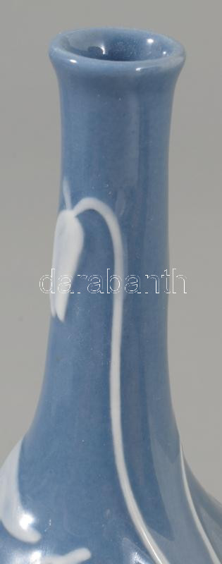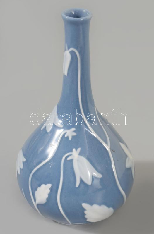 Herendi kék alapon plasztikus fehér virágmintás váza. Jelzett, hibátlan, m: 14 cm