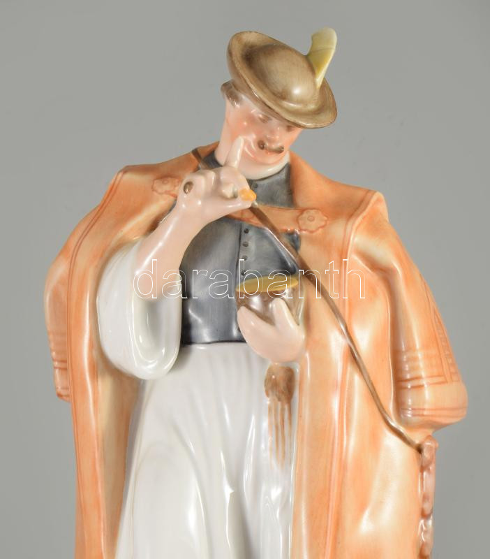 Herendi porcelán kutyáját etető juhász figura, kézzel festett, jelzett (Maugsch 1942), tolla ragaszttott, m: 20 cm