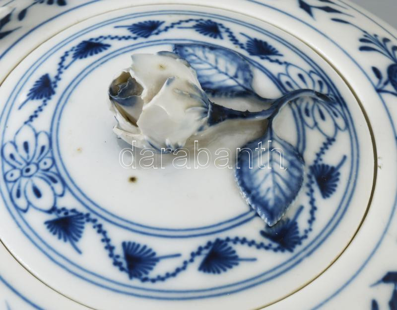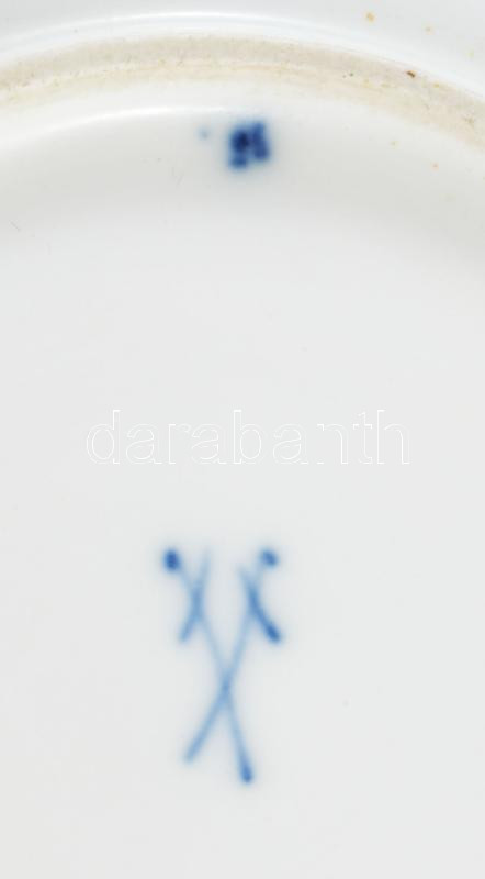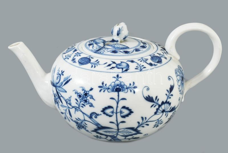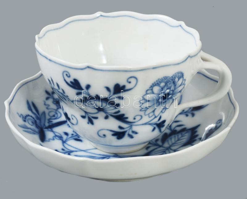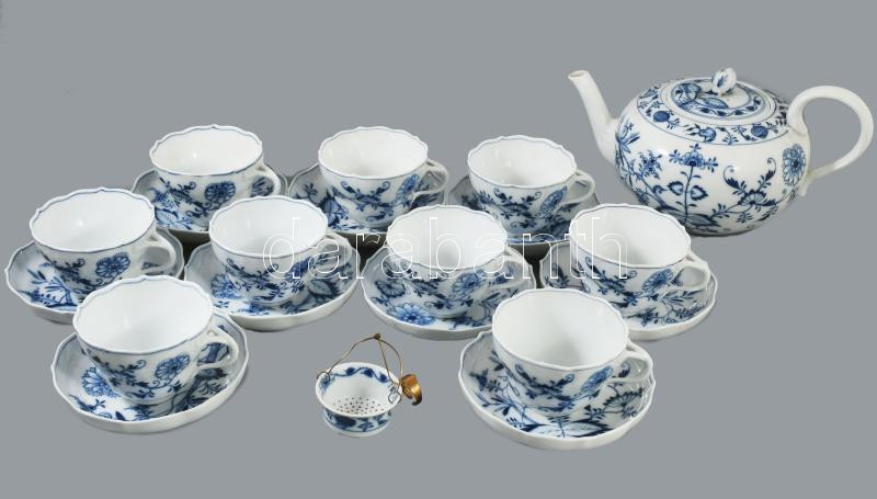 Meissen hagymamintás teás készlet. 9 darab csésze 9 darab alátéttel, teás kanna, szűrővel, cukortartó és tejkiöntő nélkül, 1-2 tűzhibával, egyik csészén lepattanással, jelzett.
