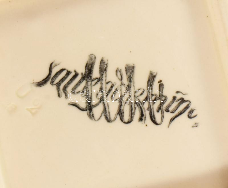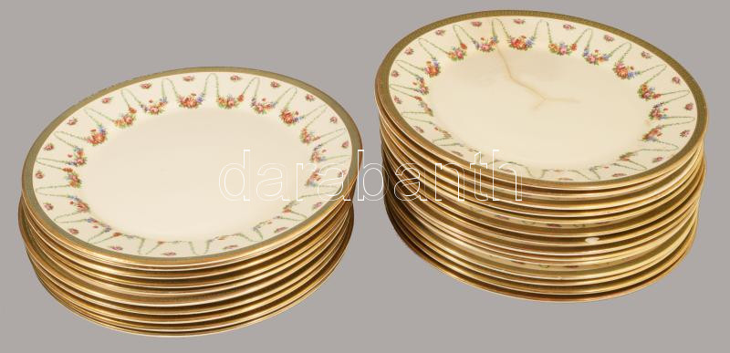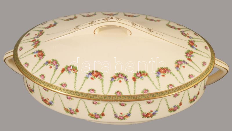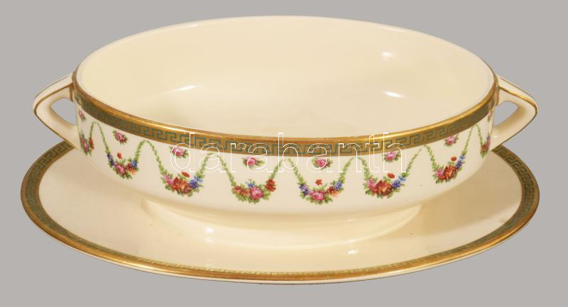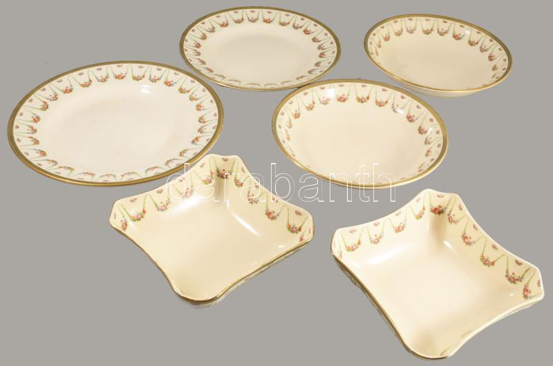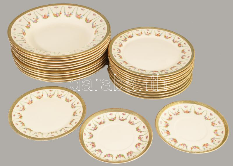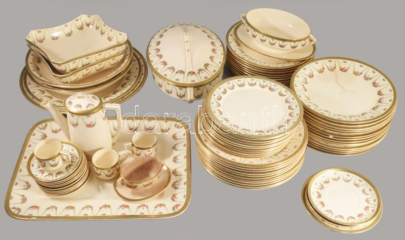 Sarreguemines nagy szervíz készlet hiányos. 24 lapos tányér. 10 mély tányér, 11 kistányyér. 11 csészealj, kávéskanna, nagy tálaló tálak, kisebb kopásokkal. Fajansz, XIX. sz. jelzett,