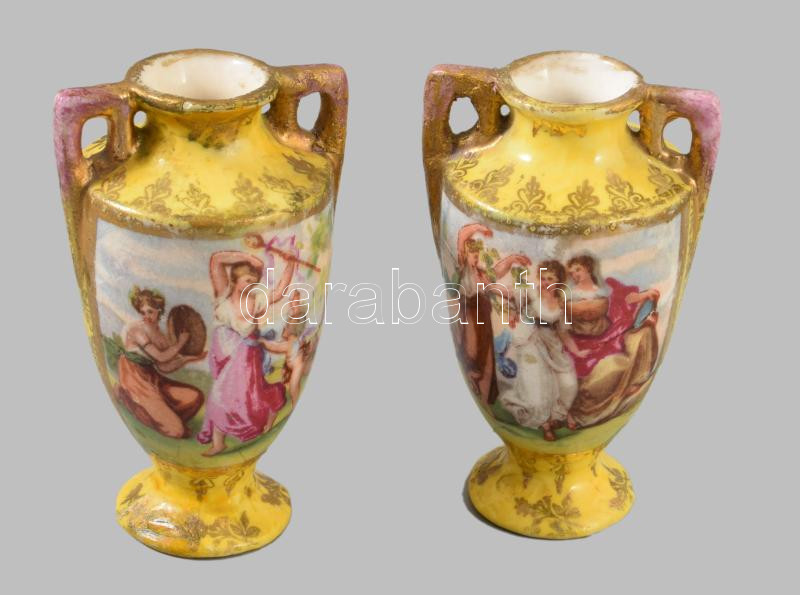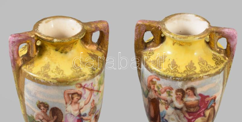 cca 1920 Cseh alt wien historizáló kisváza pár, jelzett, ragasztott, m: 7,5 cm