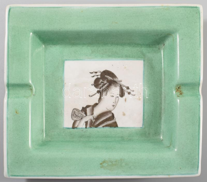 cca 1930 Kézzel festett gésamintás hamuzó, jelzett, minimális kopással, 17x19 cm