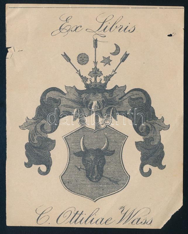 Ex Libris C. Ottiliae Wass. Klisényomat, papír, jelzés nélkül, sérült. 10x8 cm. Gróf cegei és szentegyedi Wass Ottília (1829-1917) erdélyi költő, művészetpártoló címeres könyvjegye.