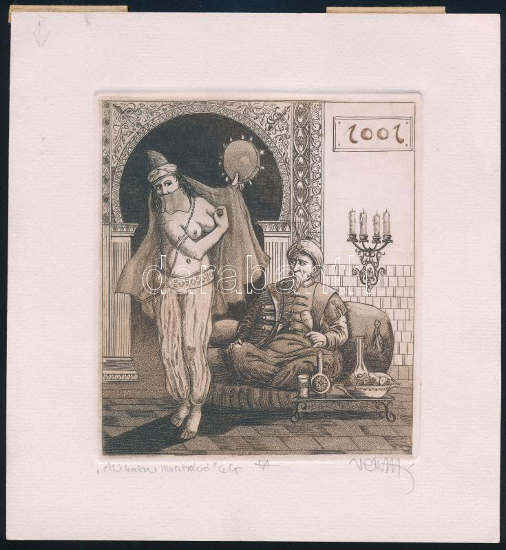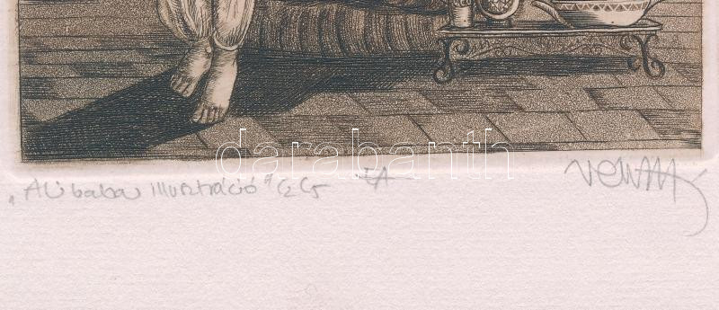 Vén Zoltán (1941- ): Ali baba illusztráció (erotikus grafika). Rézkarc, papír, jelzett, művészpéldány EA jelzéssel, hátoldalán paszpartuzás nyomaival, 12×11 cm