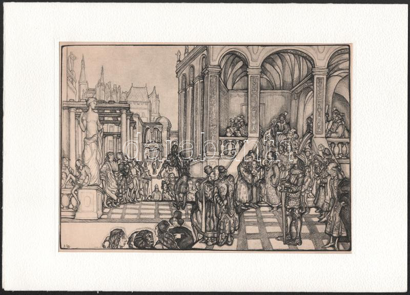 Batthyány Gyula (1887-1959): Jelenet. Nyomat, papír, jelzett a nyomaton. Paszpartuban. Az 1942-ben megjelent Képek a magyar múltból c. kiadványból. 18x25 cm
