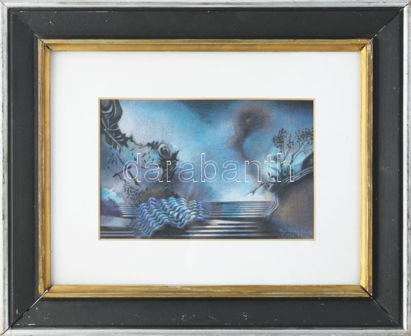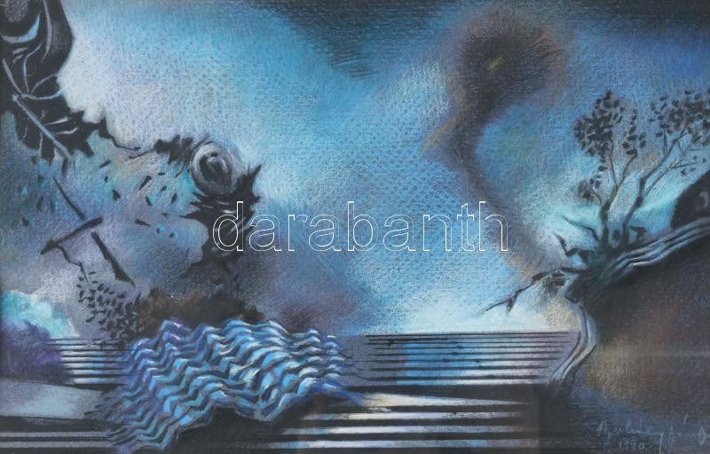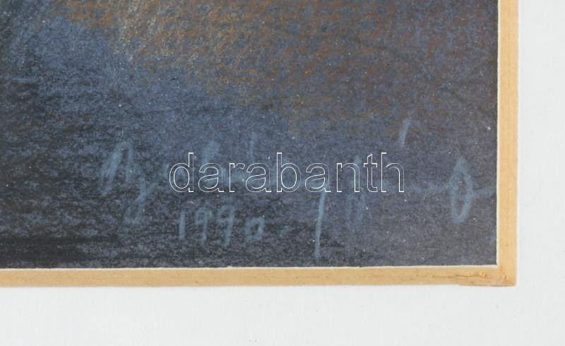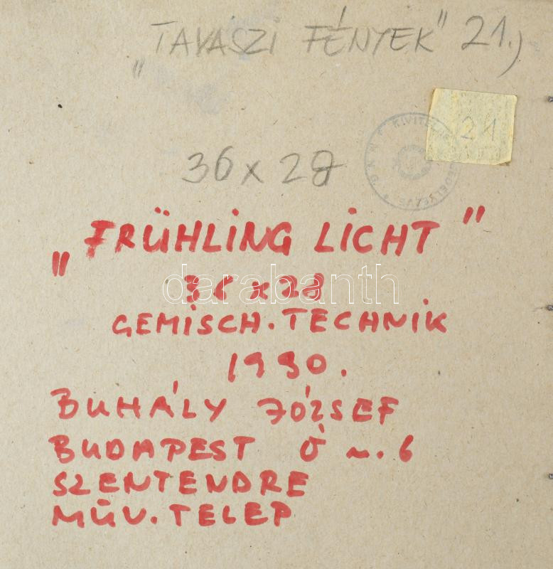 Buhály József (1945-): Tavaszi fények, 1990. Vegyes technika, papír, jelezve jobbra lent, a hátoldalán autográf felirattal. Üvegezett fakeretben. 15,5×23,5 cm