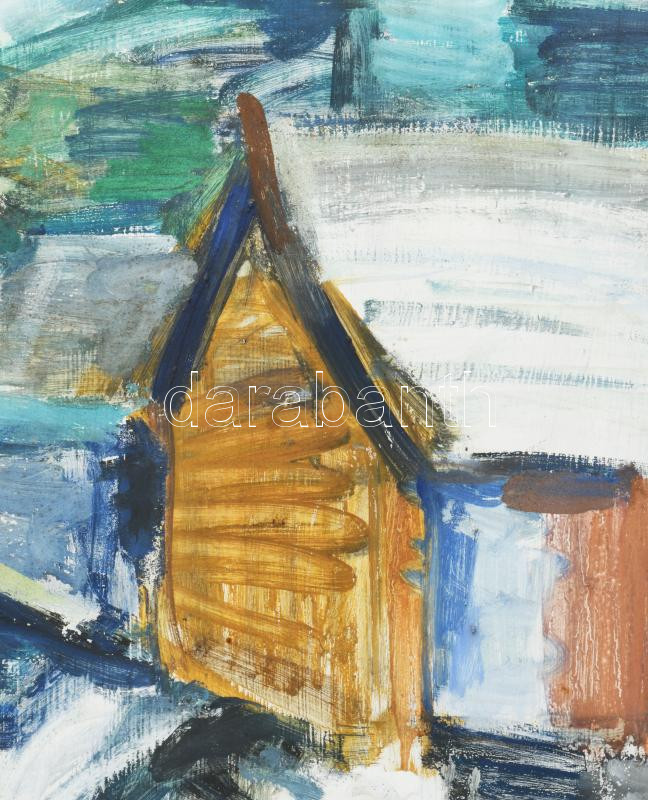 Gera Éva (1923-1996): Nagymarosi táj. Tempera, farost, jelzett. Hátoldalán Vizualart Alkotóközösség címkéjével. Keretben. 50×79 cm.