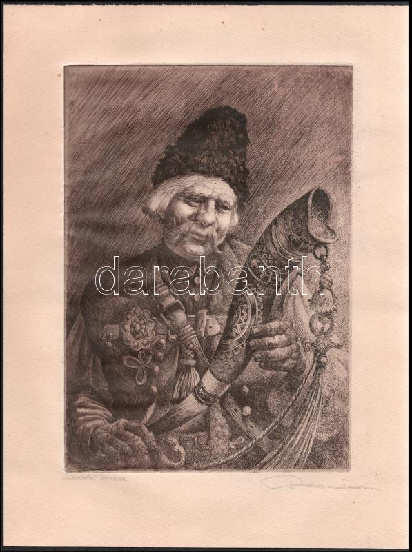 Gózon Lajos (1913-1981): Pásztor díszkürttel. Rézkarc, papír, jelzett. 30×20 cm