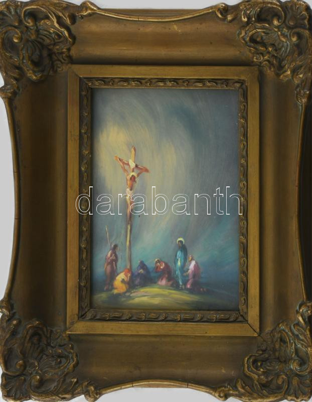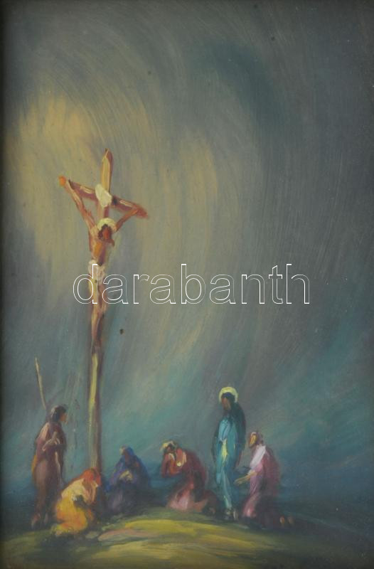 Gyügyei Nagy Zsigmond (1872-1932): Krisztus a keresztfán. Olaj, karton, jelzett, hátoldalán Gyügyei Nagy Zsigmond autográf ajándékozási soraival 1932-ből. Dekoratív, üvegezett fakeretben. 18,5x13,5 cm