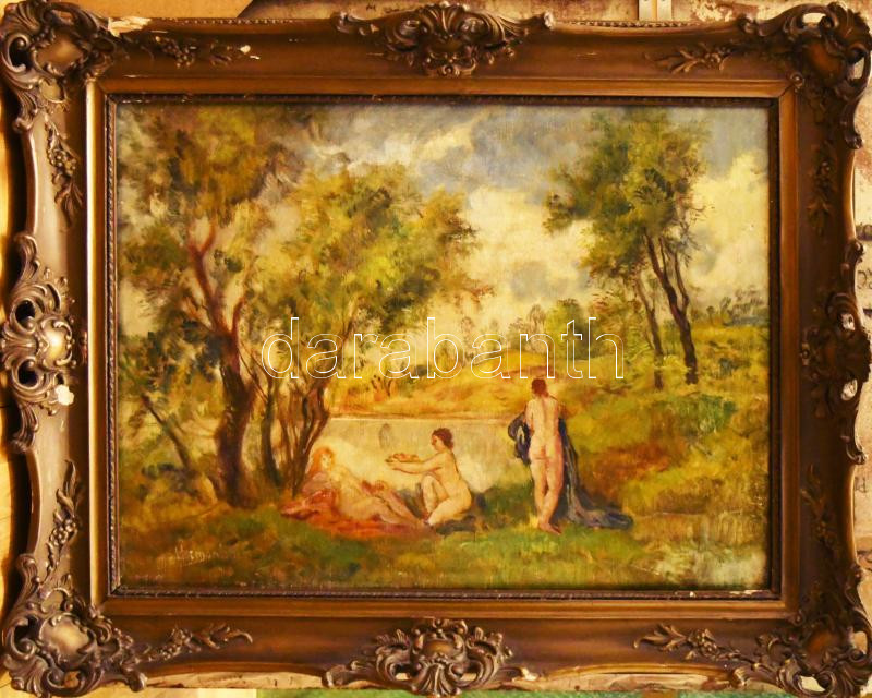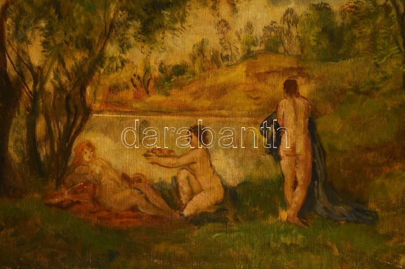 Hermann Lipót (1884-1972): Fürdőző aktok. Olaj, vászon. Jelzett. Javított. Dekoratív, sérült fakeretben. 60x80 cm