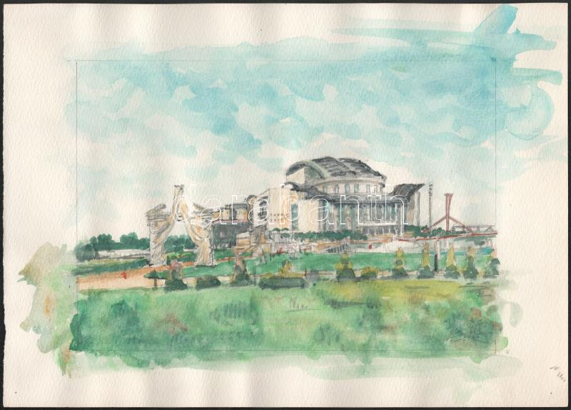Kovács Ernő (-): Az új "Nemzeti" (Budapest), 2006. Akvarell, ceruza, papír. Jelzett. 25×35 cm