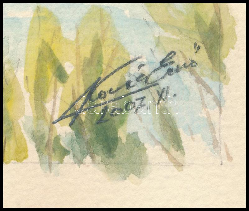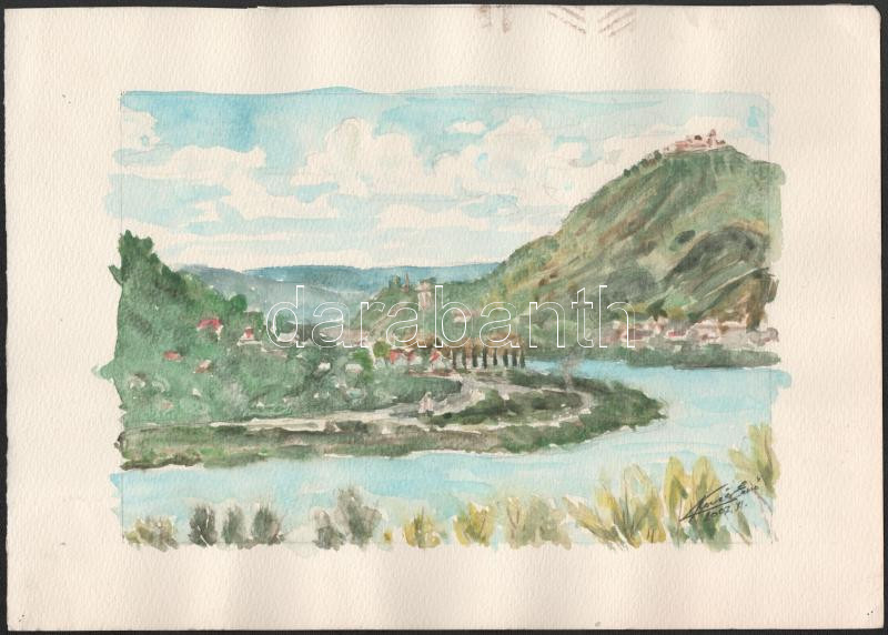 Kovács Ernő (-): Visegrádi Dunakanyar (jegenye fasorral), 2007. Akvarell, ceruza, papír. Jelzett. Lapszéli elszíneződéssel. 25×35 cm