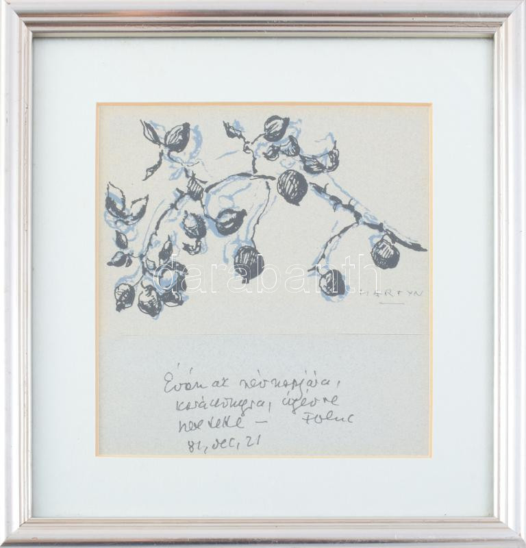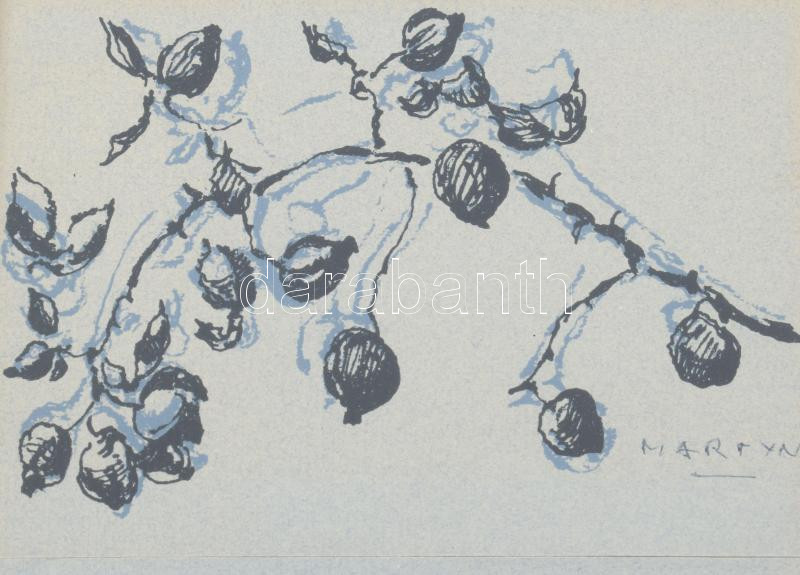 Martyn Ferenc (1899-1986): Ágas-bogas (cím nélkül). Nyomat, papír, jelzett, Martyn Ferenc autográf ajánlásával 1984-ből, üvegezett fakeretben, 15x14 cm