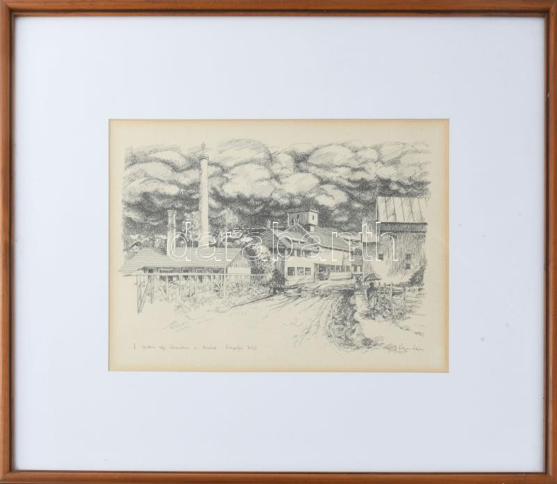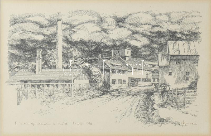 Sólyom Lajos (1935-2024): Nagyvárad, a szöllősi régi vízimalom a Pecével. Litográfia, papír, jelzett, számozott (30/13), üvegezett fakeretben, 21x30 cm.