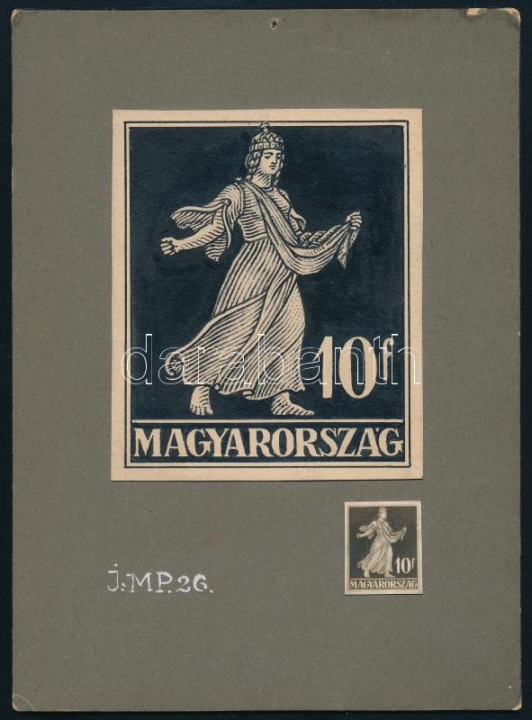 Szege Sándor (1883-1945): 10 fillér bélyeg terve (vető Hungáriához hasonló alak magyar koronával), 1926 körül. Tus, papír. Jelzés nélkül. Kartonra kasírozva. 9,5x8 cm. Kartonon a kész bélyeg is szerepel!