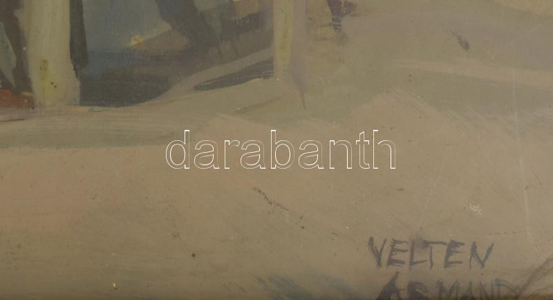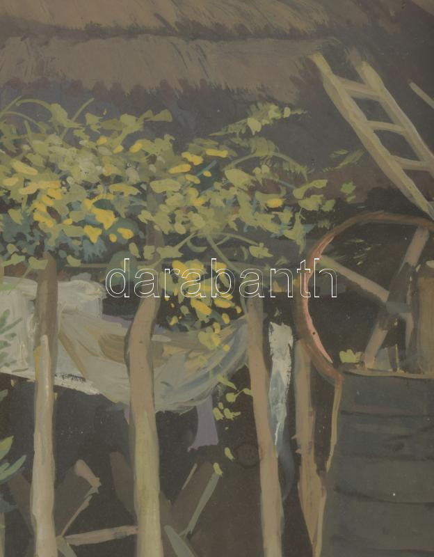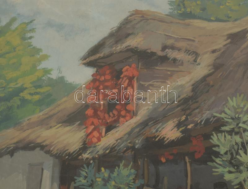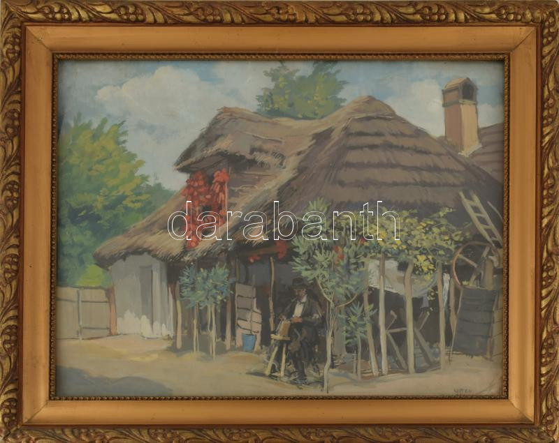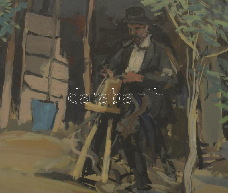 Velten Armand (1890-1974): Köszörülés (Gödöllő környéke), 1930-40 körül. Tempera, karton. Jelezve jobbra lent. Üvegezett, kissé sérült fakeretben. 39,5x48 cm