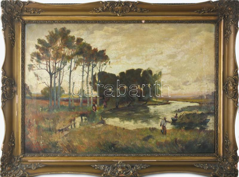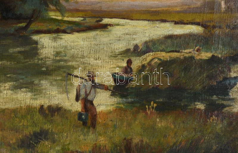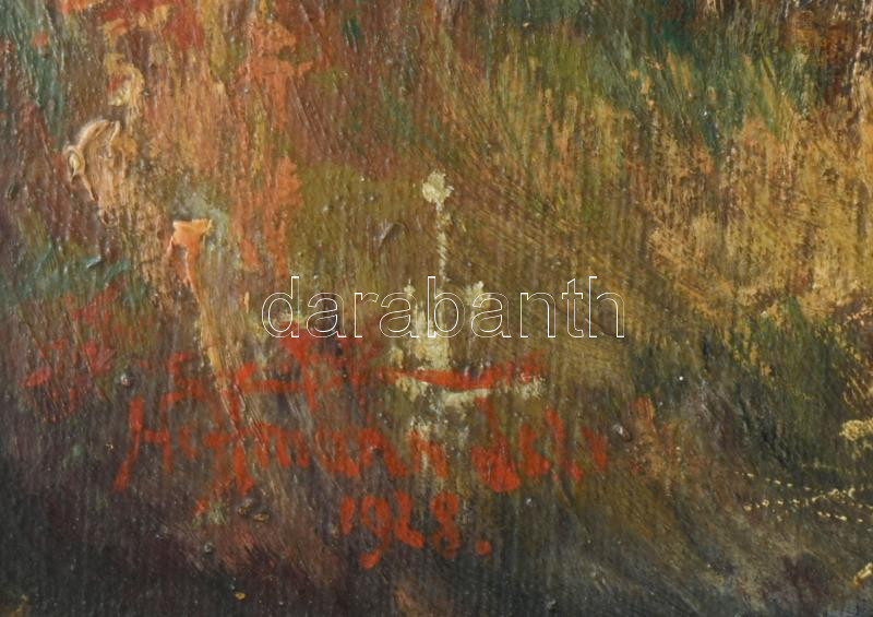 Hoffmann J jelzéssel: Hazafelé induló társaság, 1928. Olaj, vászon. Dekoratív, sérült fakeretben, 37×55,5 cm