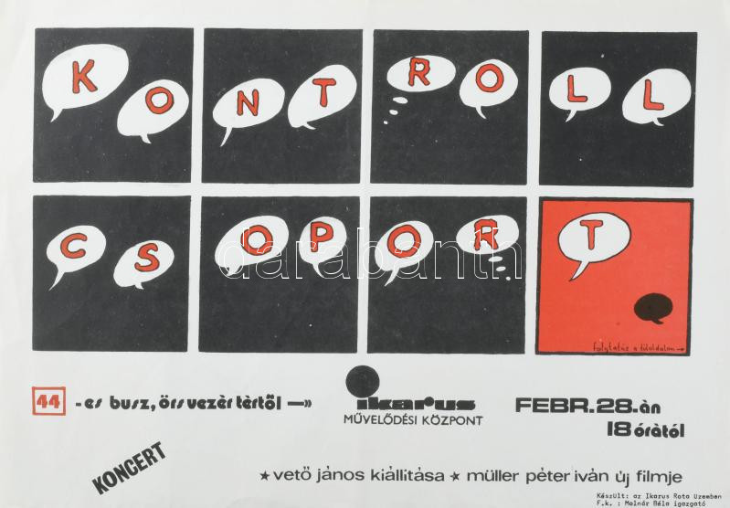 1982 Kontroll Csoport koncert, Vető János kiállítása, Müller Péter Iván (Sziámi) új filmje, Ikarus Műv. Közp., underground-alternatív plakát, papír, jelzés nélkül, Ikarus Rota Üzem. hajtásnyomokkal, egészen apró lapszéli szakadással, 29,5x41,5 cm