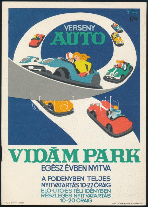 Gönczi-Gebhardt Tibor (1902-1994): Vidámpark, versenyautó, 1972. Villamosplakát, papír, jelzett a plakáton, Offset-nyomda, lapszéli hajtásnyommal és apró gyűrődéssel, 24×17 cm