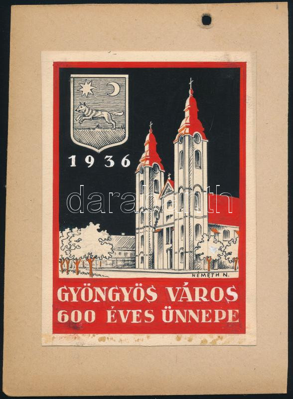 Németh Nándor (1910-1978): Gyöngyös város 600 éves ünnepe, 1936 (plakátterv). Tempera, tus, papír, jelzett. Kartonra kasírozva. Kisebb elszíneződésekkel. 17x12,5 cm