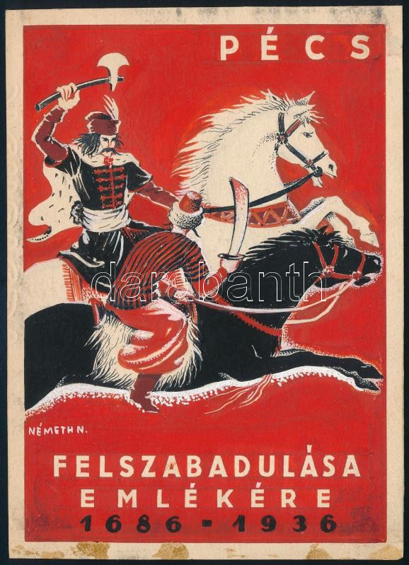 Németh Nándor (1910-1978): Pécs felszabadulása emlékére, 1686-1936 (plakátterv). Tempera, ceruza, papír, jelzett. Kisebb elszíneződésekkel. 17x12 cm