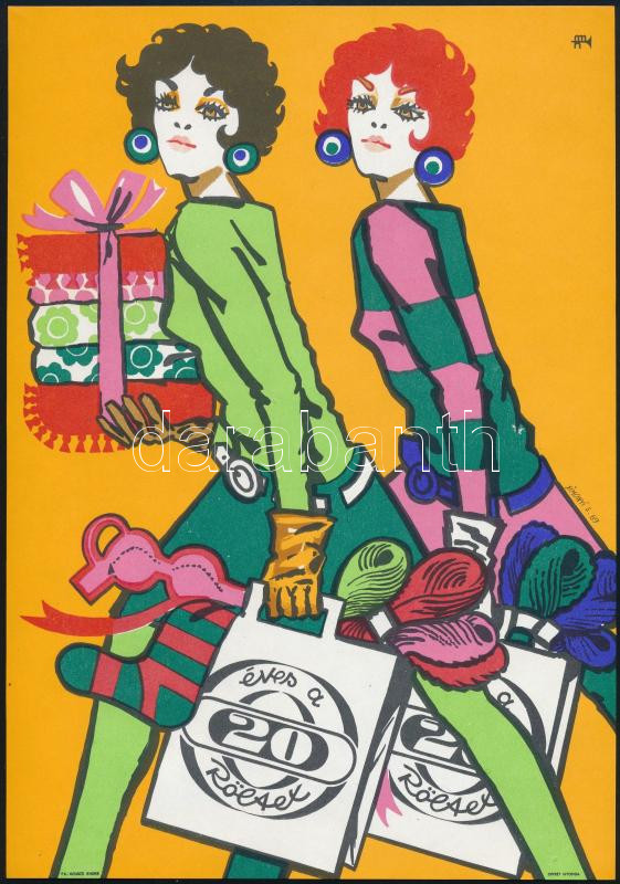 Simonyi Emő (1943-): 20 éves a Röltex, 1969, divatplakát, villamosplakát, ofszet, papír, jelzett a plakáton, Offset Nyomda, 23,5x16,5 cm. Magyar pop art plakát!