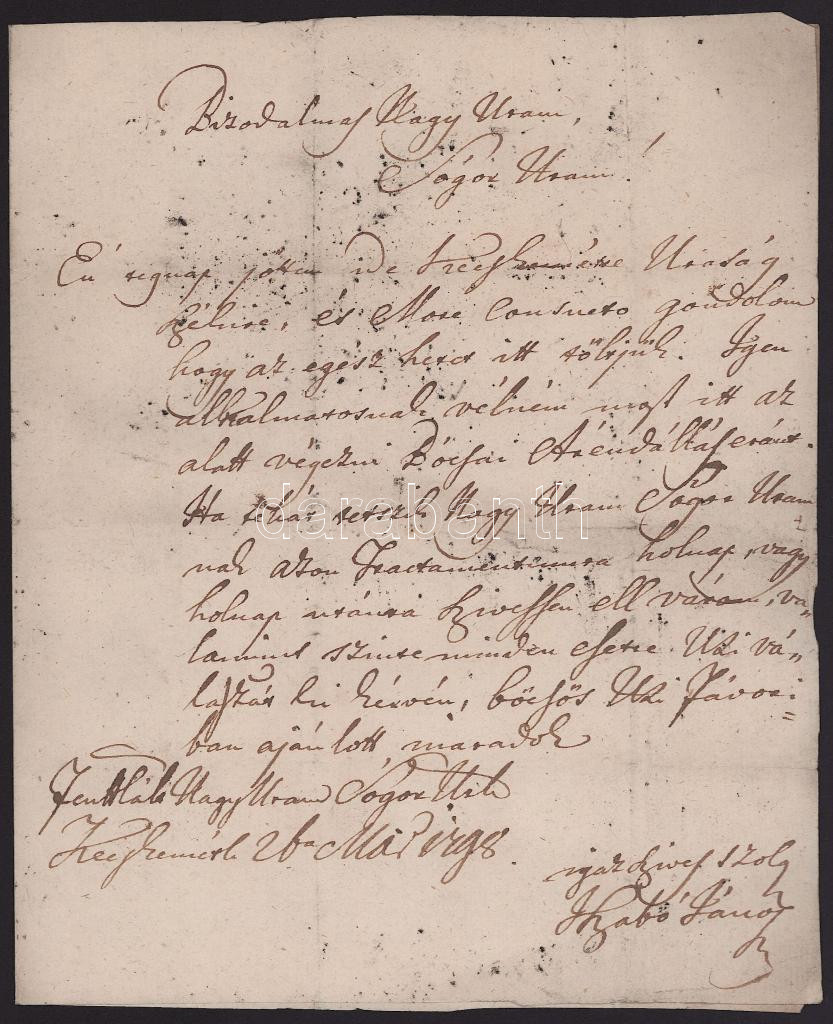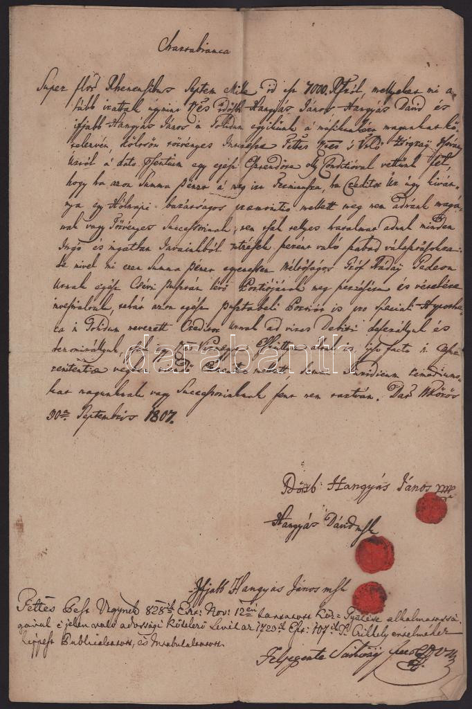 1807 Nagykőrös a Hangyás család két tagja Hangyás János és Hangyás Dávid előzetes felhatalmazó levele Zsigray Istvánnak aláírásukkal és gyűrűs pecsétjükkel.