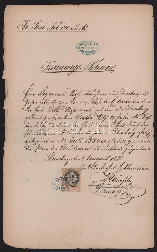 1881 Pozsony, német nyelvű házasságkötési anyakönyvi kivonat 50 kr okmánybélyeggel