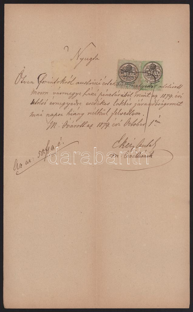 1879 Mosonmagyaróvár, nyugta 10+10 kr okmánybélyeggel