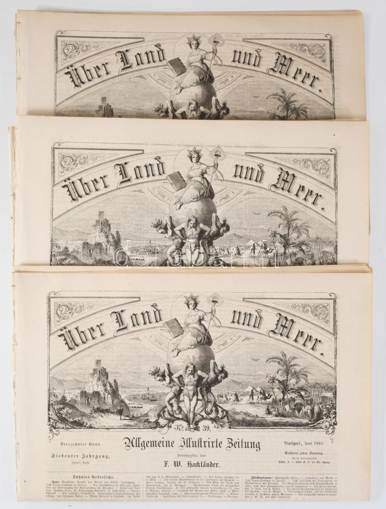 1865 Über Land und Meer c. német nyelvű képes folyóirat 3 db száma, számos fametszetű illusztrációval