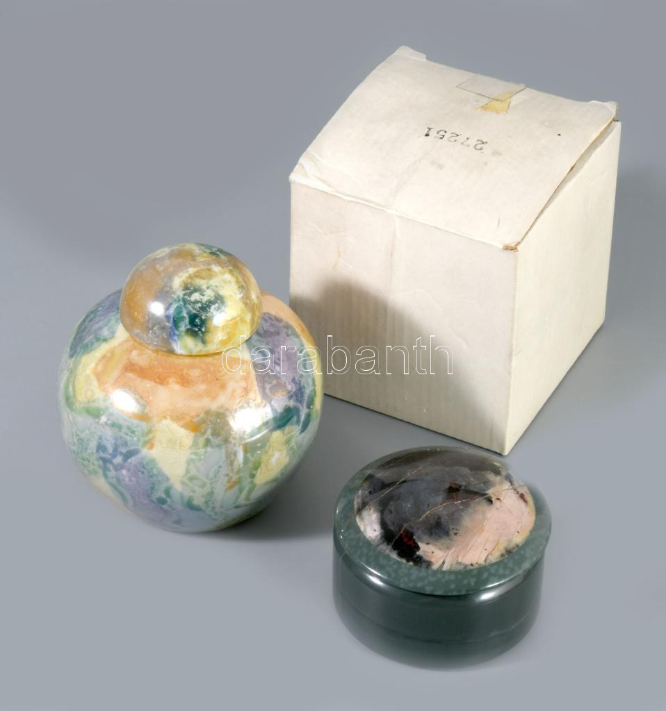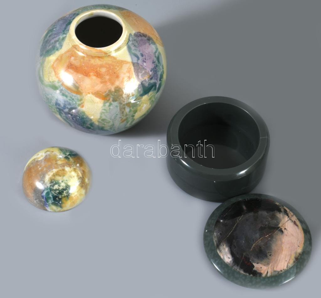 Ékszertartó műkő edényke d: 7 + irizáló porcelán edényke, eredeti dobozában 9 cm