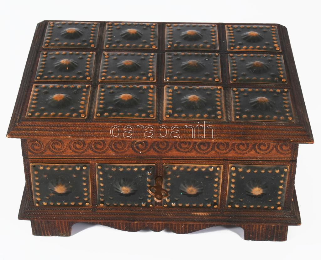 Kincses doboz. Rézlapokkal dekorált, faragott fa, kulcsos zárral. 20x15 cm
