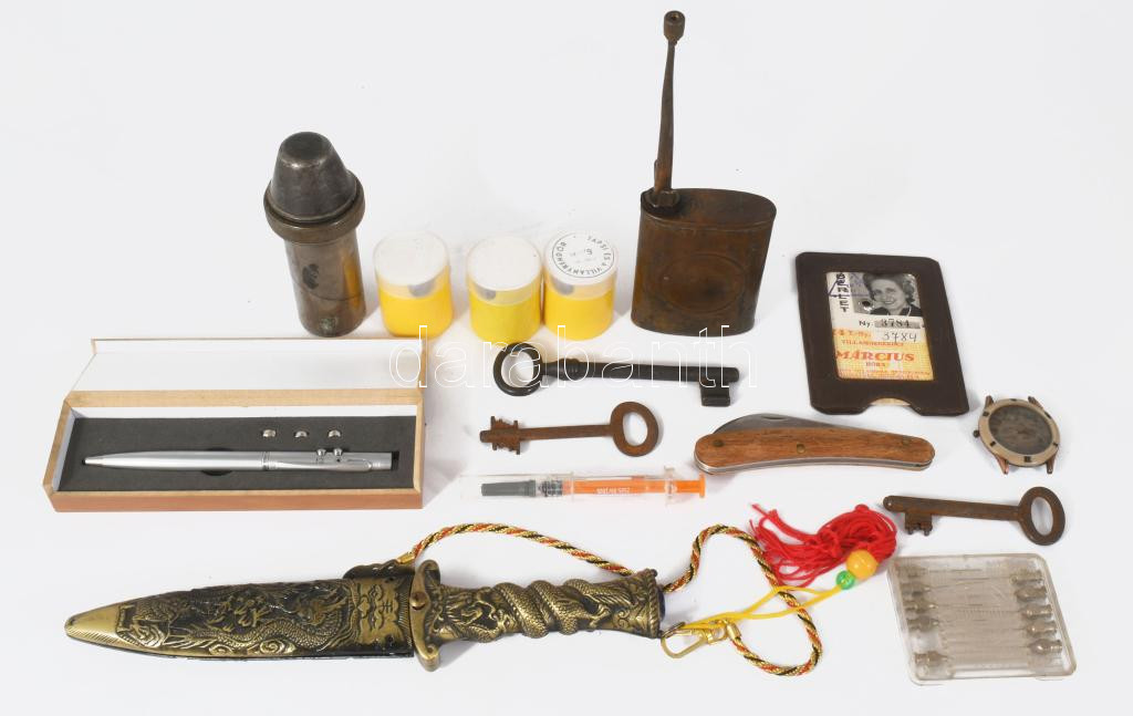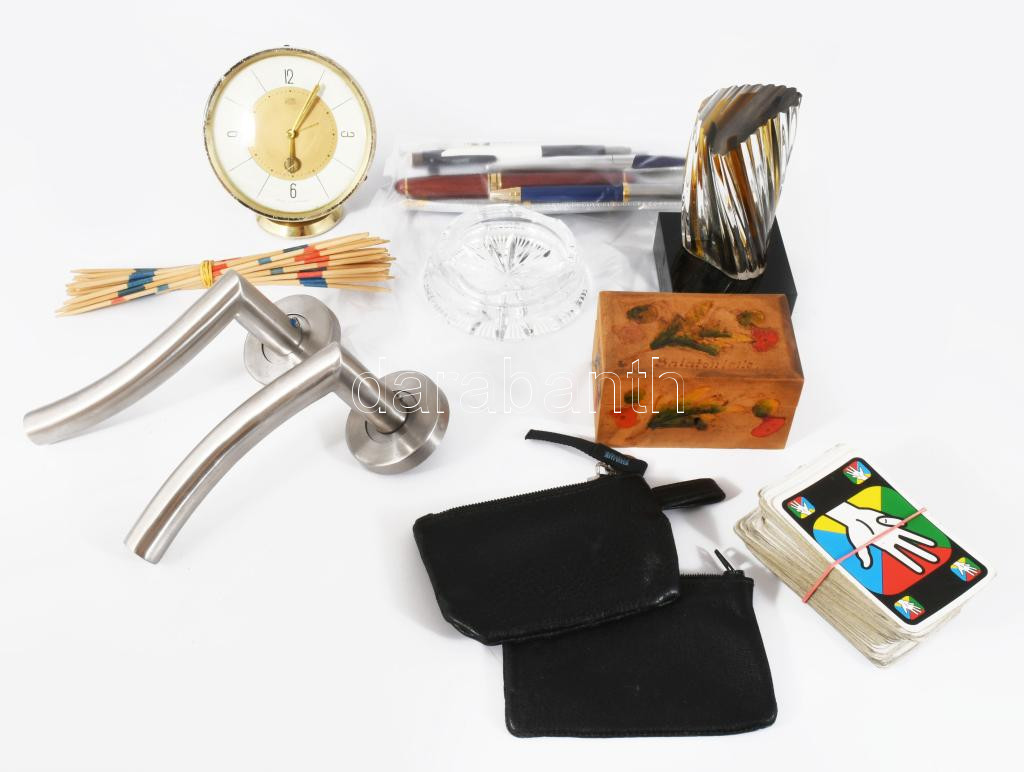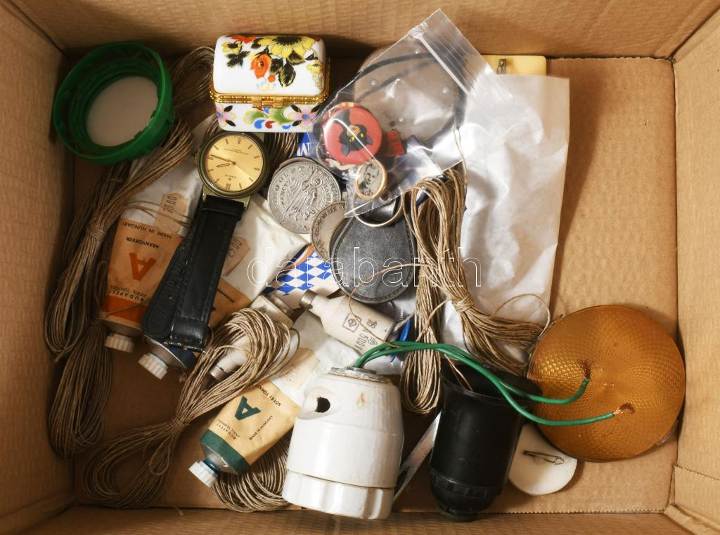Doboznyi vegyes bolha tétel, közte kvarc karóra, üveg hamuzó, kitűzők, stb.