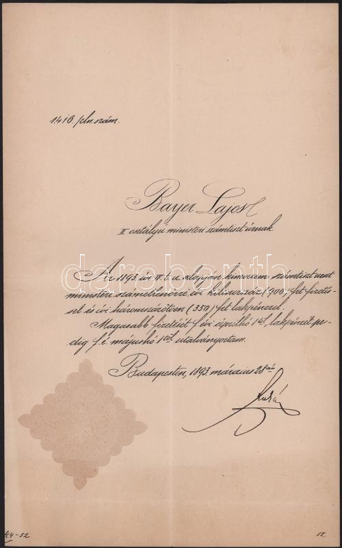 1893 Bp., Lukács Béla (1847-1901) politikus, országgyűlési képviselő, kereskedelemügyi miniszter autográf aláírása kinevezésen