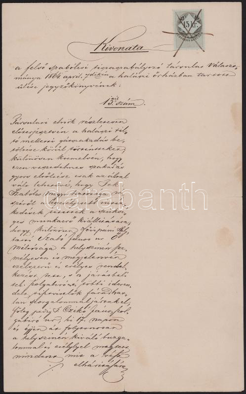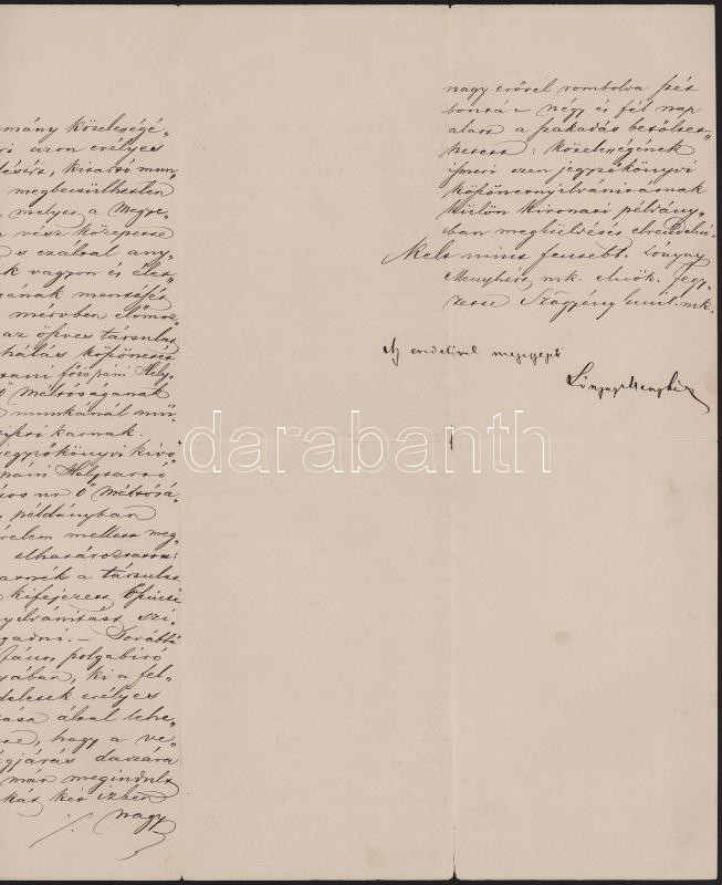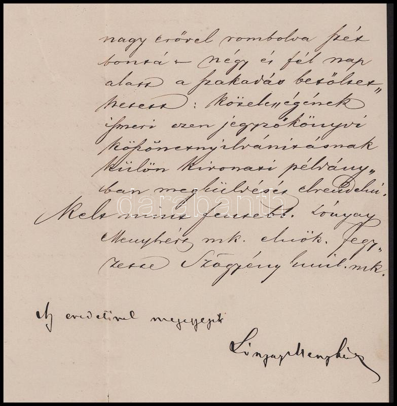 1864 nagylónyai és vásárosnaményi Lónyay Menyhért (1822-1884) arisztokrata politikus, pénzügyminiszter (a Magyar Királyság 3. pénzügyminisztere, illetve az Osztrák-Magyar Monarchia 2. közös pénzügyminisztere), a Magyar Királyság 4. miniszterelnöke, az MTA tagja és elnöke autográf aláírása a felső-szabolcsi tiszaszabályozó társulat jegyzőkönyvének kivonatán, kisebb lapszéli szakadásokkal