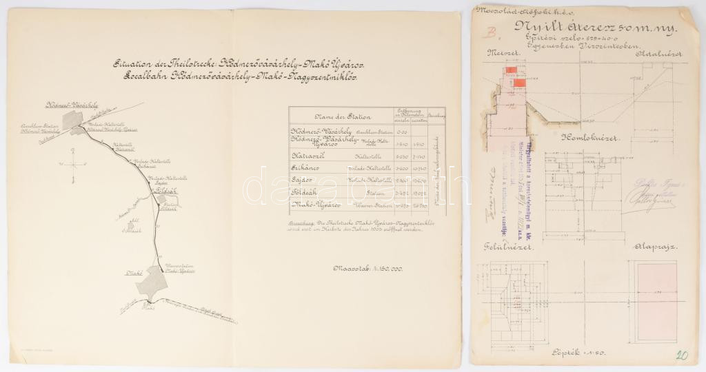 ca 1880 A Hódmezővásárhely- Makó Újváros - Nagyszentmiklós közötti helyi érdekű vasút alaprajza 41x34 cm + 1895 A Mocsolád - Siófoki h.é.v. építési szelvény rajza. Kézzel rajzolva.