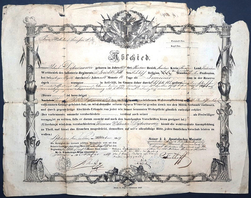 Díszkerettel övezett, német nyelvű leszerelési oklevelünket az 1681-ben alapított, ez idő szerint Krakkóban állomásozó császári-királyi Prinz Wilhelm von Preussen 20. számú gyalogsági ezred állította ki a galíciai helyőrségben, a Kárpátok előterében álló katonai kisvárosban, Újszandecben (Neu Sandez).