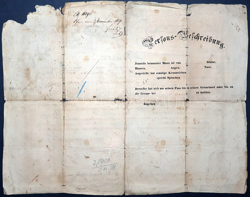 Nyomtatványunk jobb felső sarkán apró, az oldaltükröt alig érintő hiány, az oklevélen apró elszíneződések, a hajtások mentén apró szakadásnyomok, a lapszélen apró gyűrődések, a hátoldalon kézírásos jegyzetek.
