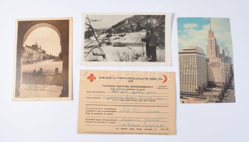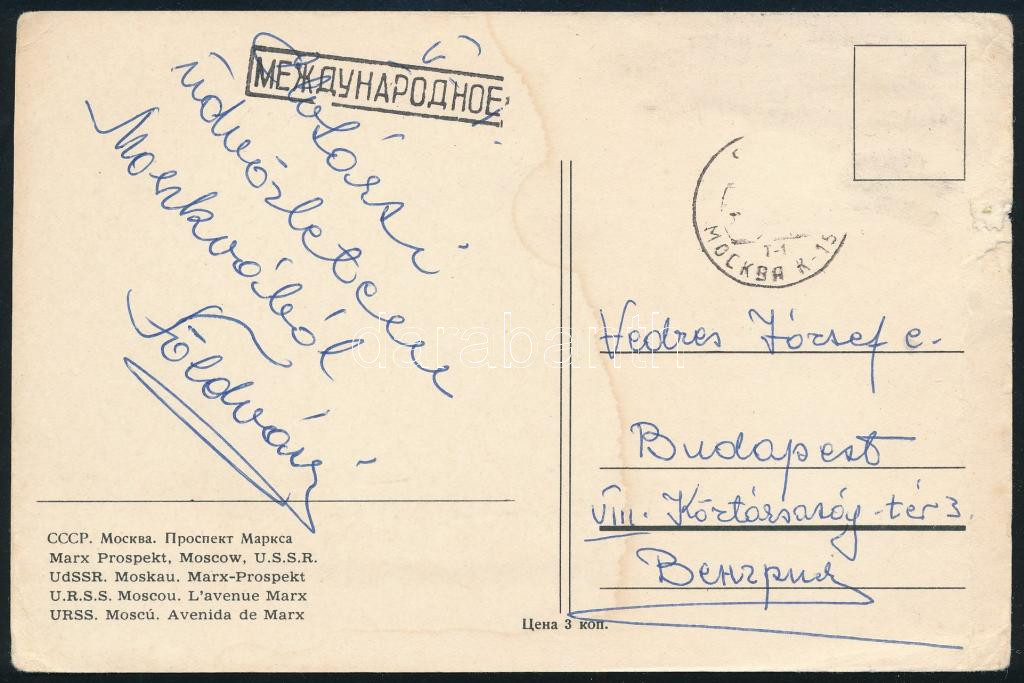 Földvári Aladár (1906-1973) Kossuth-díjas geológus, egyetemi tanár autográf aláírása és sorai Moszkvából hazaküldött képeslapon, ázásnyommal