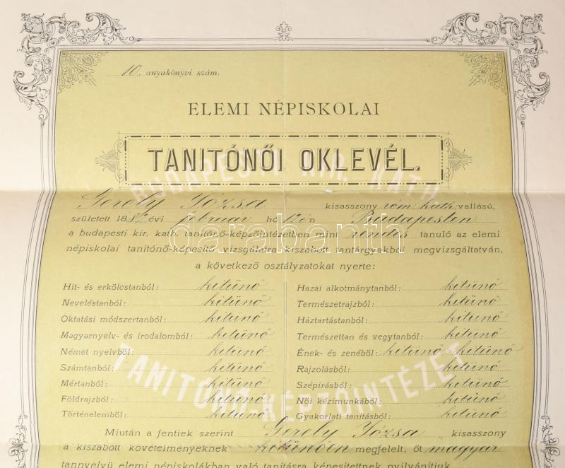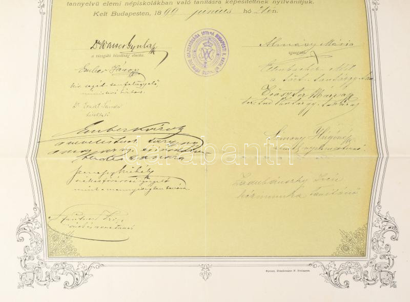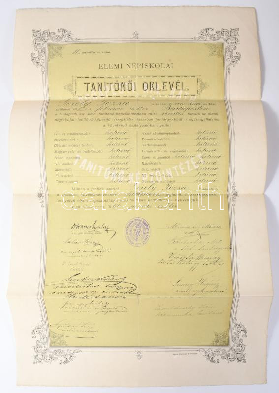 1899 Bp., Gerely Józsa Jolán (1882-1945) polgári iskolai tanítónő, katolikus vallási írónő (a Horthy-korszakban nőneveléssel kapcsolatos könyveiről lett ismert) elemi népiskolai tanítónői oklevele, rajta számos aláírással, köztük Ernszt Sándor (1870-1938) római katolikus pap, hitoktató, később pápai prelátus, országgyűlési képviselő, a Magyar Királyság népjóléti minisztere, illetve vallás- és közoktatásügyi minisztere; Ember Károly (1863-1938) tanítóképző-intézeti igazgató; Szenessy Mihály (1854 k.-1904) polgári iskolai igazgató; Szantner Zsigmond, Almásy Mária, Zadubánszky Irén és mások. Hajtva, kis sérülésekkel, 47,5x29,5 cm