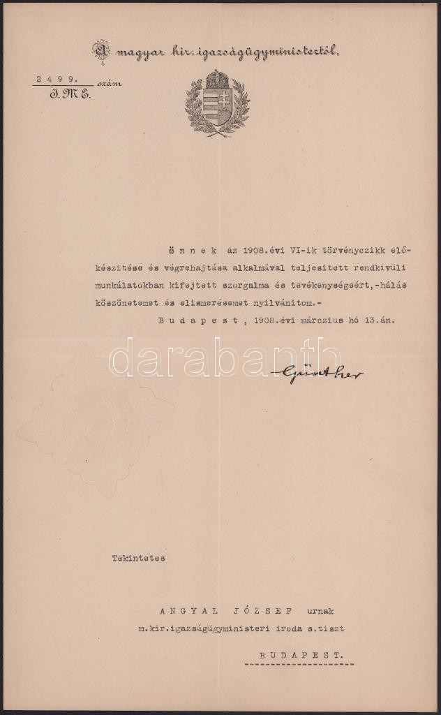 1908 Bp., Günther Antal (1847-1920) újságíró, ügyvéd, országgyűlési képviselő, igazságügy-miniszter autográf aláírása elismerésen, papírfelzetes pecséttel