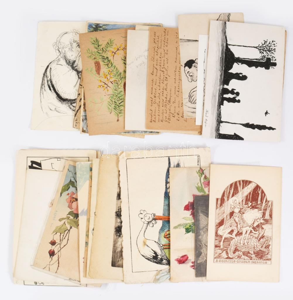 ca 1900-1930 30 db kézzel rajzolt képeslap nagyságú grafika klf alkotóktól, témákkal és korokból