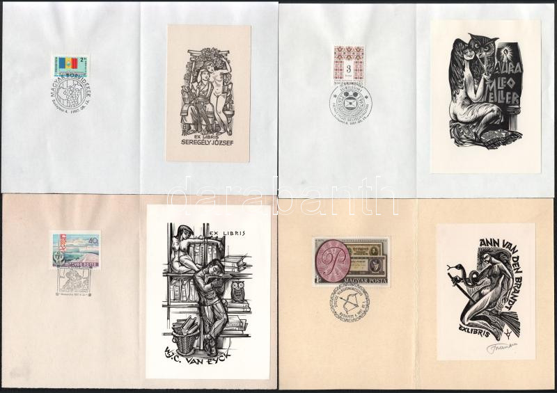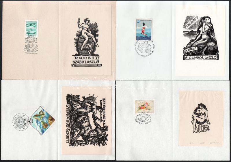 Klf. magyar és külföldi alkotók (Várkonyi Károly, Drahos István, Menyhárt József, Perei Zoltán stb.): 19 db erotikus halmozott grafika, bélyegző, bélyeg, ex libris, többségében jelzett a metszeten, klf. méretekben.