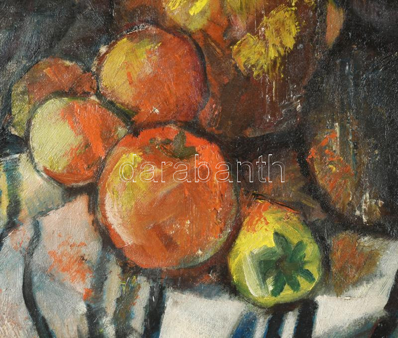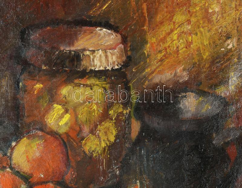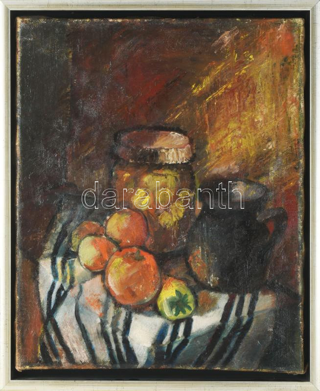 Jelzés nélkül, XX. sz. első fele: Csendélet. Olaj, vászon, hátoldalán Pécsi Képzőművészek és Műbarátok Társasága 1933 tavaszi kiállításának raglapján nehezen olvasható névvel és tanulmányfej címmel. Fakeretben. 50×40 cm
