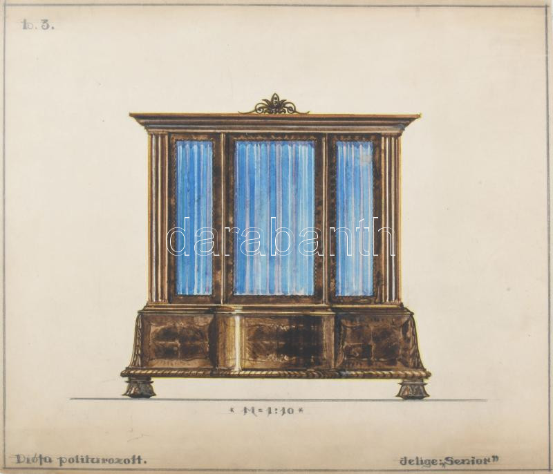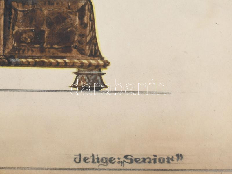 cca 1900-1940 Historizáló diófa bútor tervrajza. Akvarell, ceruza, karton, m 1:10, jelzés nélkül, jelige: "Senior", hátoldalán felületi sérülésekkel, 32,5×38 cm